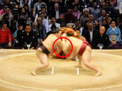 (画像出典:2016年11月18日放送 NHK総合1 大相撲九州場所六日目 画像内円は筆者)