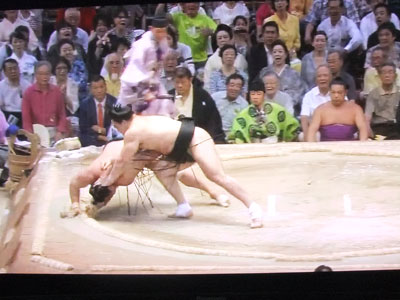 ↑原因は、昨日(2014年7月17日)のこの取り組み。横綱の日馬富士(はるまふじ)と対戦して、豊真将は互角の良い相撲を取っていたのですが、最後の最後、脚が開きかかった状態で上から変な角度で押し込まれ、このときに右膝を負傷。